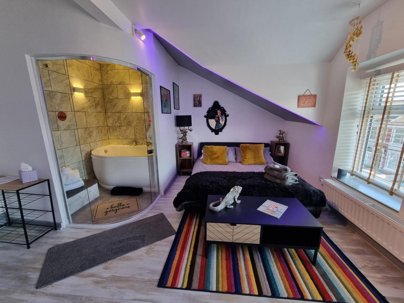 Deluxe Suite with Spa Bath. This suites standout feature is the hot tub. This suite includes 1 bedroom, a seating area and 2 bathrooms with a bath and a shower. This suite has a tea and coffee maker, flat-screen TV with streaming services, a quiet street view, as well as chocolate for guests. The unit has 1 bed. ;