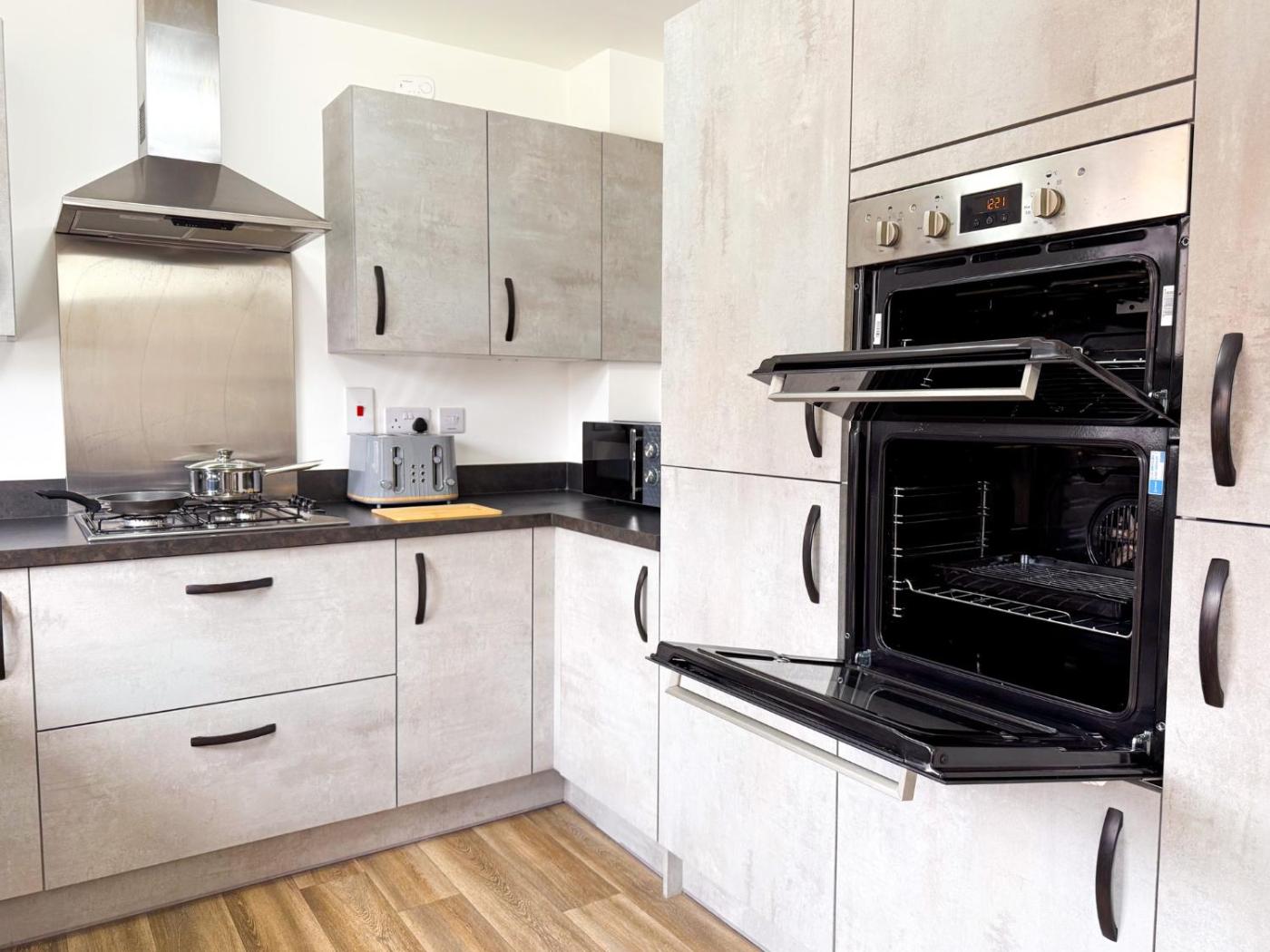 Four-Bedroom House. The holiday home features 4 bedrooms, 4 bathrooms and a kitchen. The holiday homes kitchen is available for cooking and storing food. This holiday home provides a washing machine, a flat-screen TV and garden views. The unit offers 8 beds.