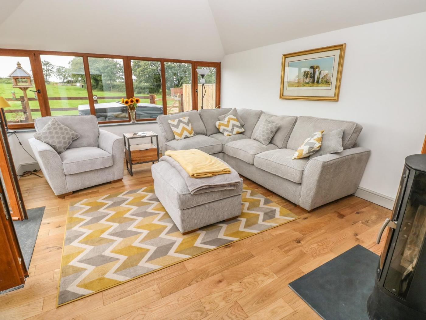 The holiday home has 2 bedrooms, a TV, a fully equipped kitchen with a dishwasher and a microwave, a washing machine, and 1 bathroom with a hot tub. Featuring free private parking, this 4-star holiday home also features free WiFi. There is also a seating area and a fireplace.